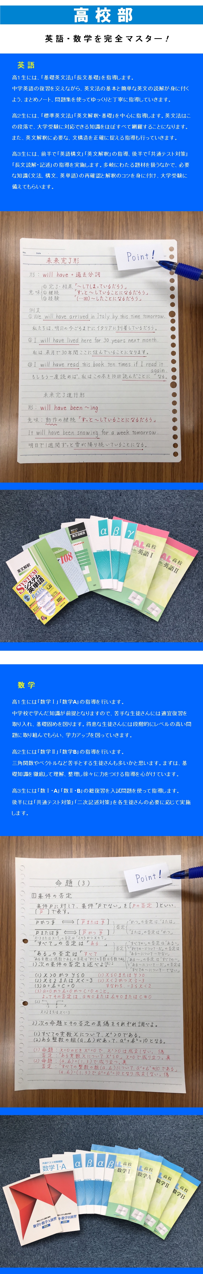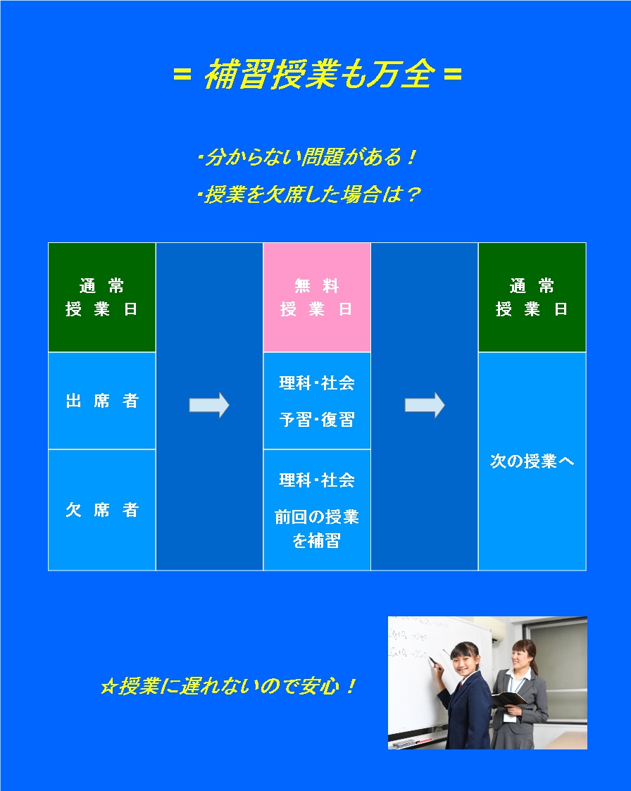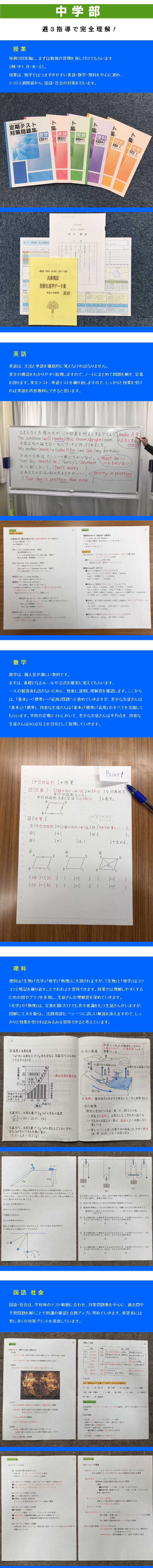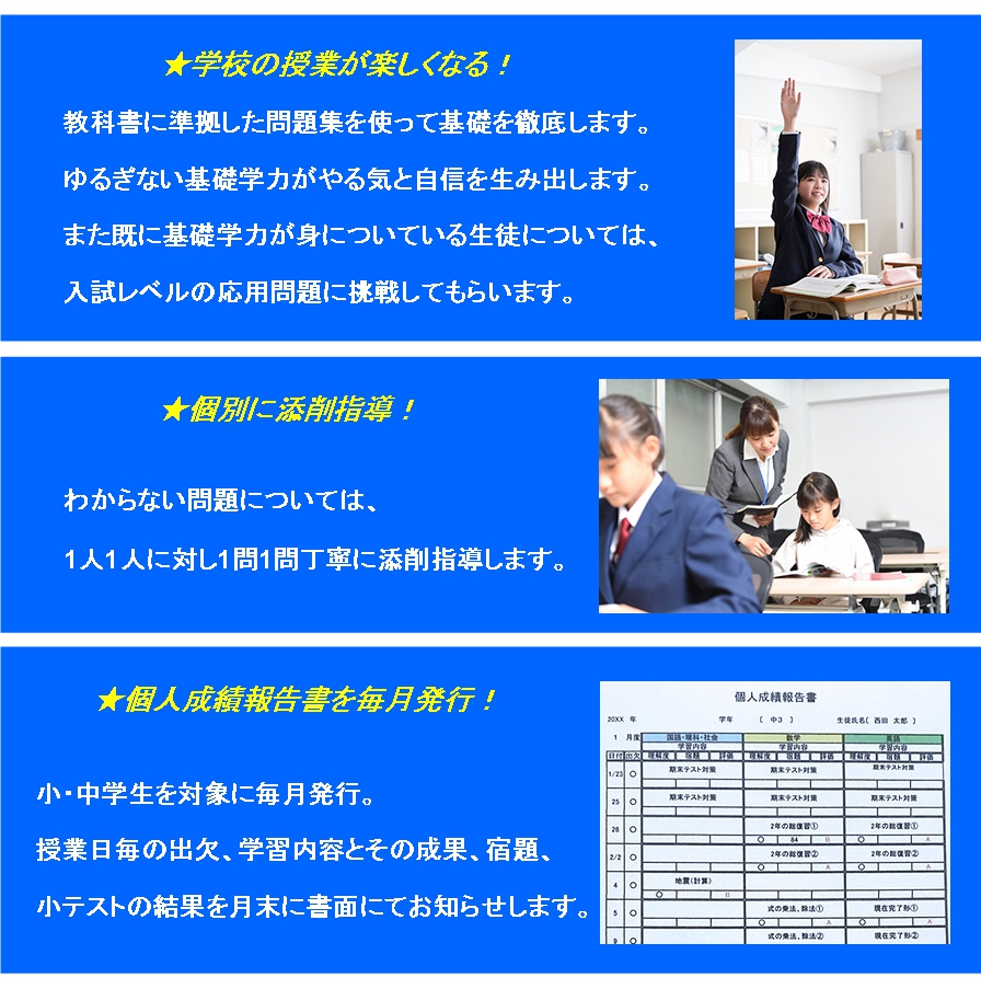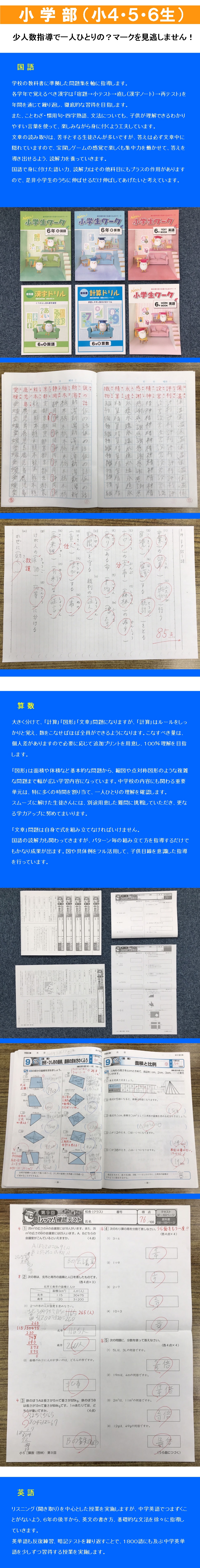 小学生:教科書に合わせ、100%の理解を目指して指導します。
